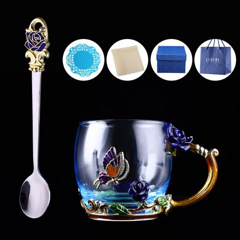 PERFECT HANDMADE ENAMEL CUP: The handmade enamel glass cup has an elegant style with butterfly and rose flower 3D designs. There are no cups exactly like yours in the world. Yours is only one and will never fade as time passed, even if you use the mug daily. The glass material of the cup is glittering and translucent, classic but refined and the noble stylish look is functional yet decorative.