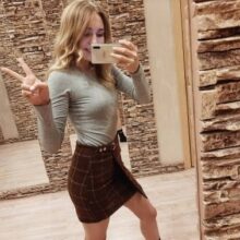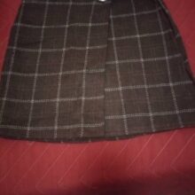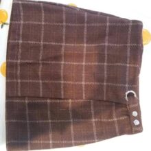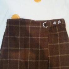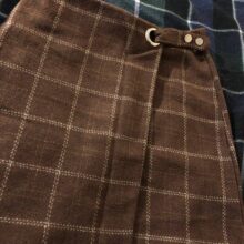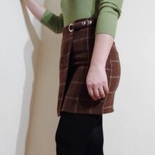 Exude warmth and elegance on chilly winter days in this wool plaid mini skirt. This charming wraparound skirt flaunts classic good looks that make it the picture of wintery sophistication, but leaves enough room for you to play around with your favorite styles and fashion preferences. It has a smart A-line silhouette and closes with a chic circular belt buckle detail at the waist. Two vintage buttons on the belt perfectly complement the stylish plaid print that adorns this brown mini skirt.